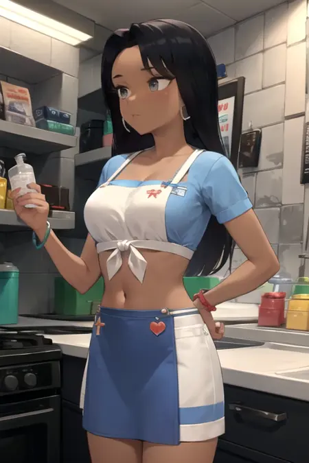 BilzarbraSmith, 1girl, solo, long hair, blue skirt, blue shirt, black hair, navel, jewelry, short sleeves, earrings, midriff, very dark skin, apron, bracelet, dark-skinned female, crop top, waist apron, front-tie top, tied shirt