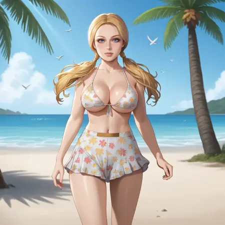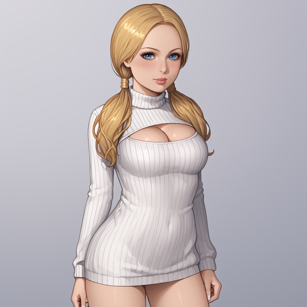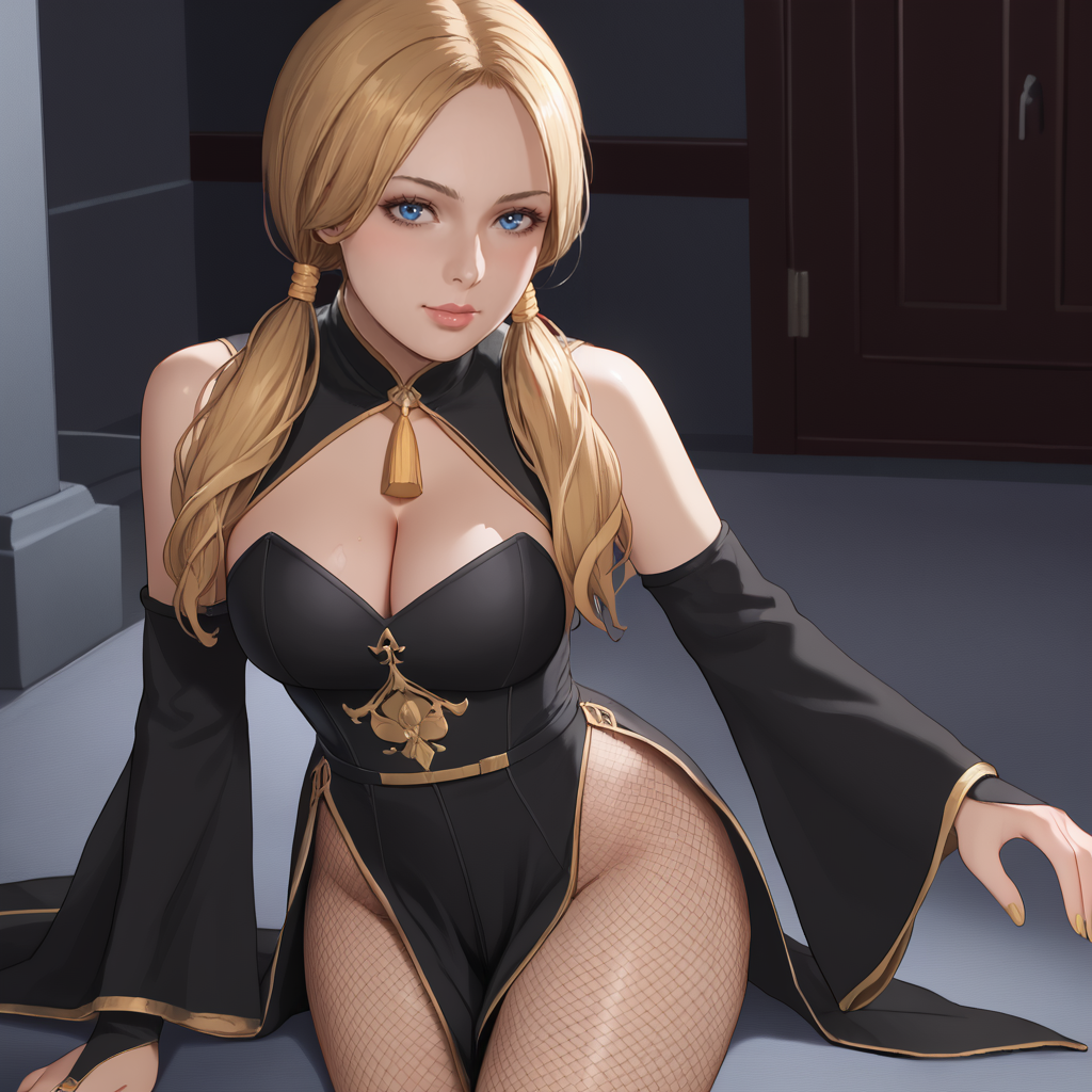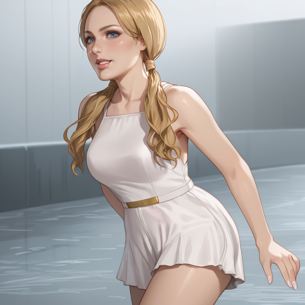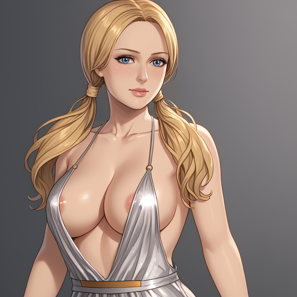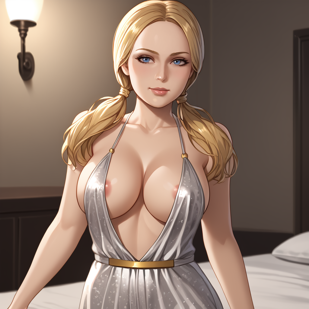 トリガー:KatherineWarren, 1girl, solo, ブロンドヘア, ツインテール, 長髪, 青い目, ネイルポリッシュ, ジュエリー, カウボーイショット, ドレス