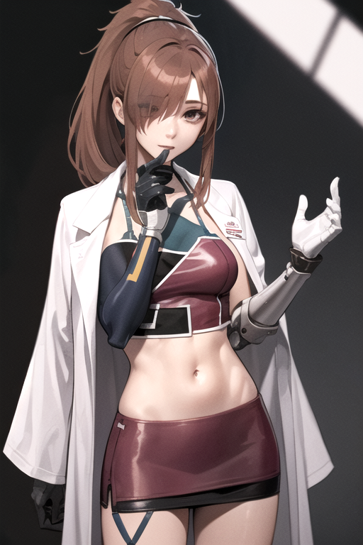 ShaluaRui, 1girl, solo, long hair, miniskirt, light brown hair, gloves, navel, hairband, midriff, miniskirt, maroon crop top, halterneck, pencil skirt, labcoat, single mechanical arm, high ponytail, hair covered one eye