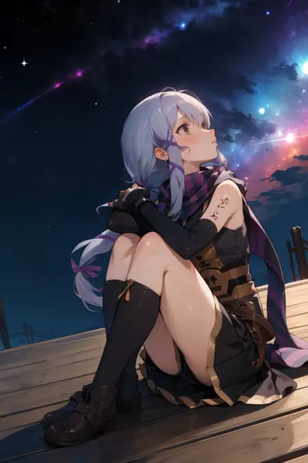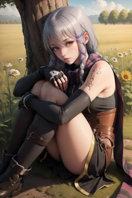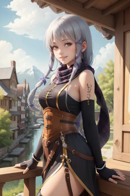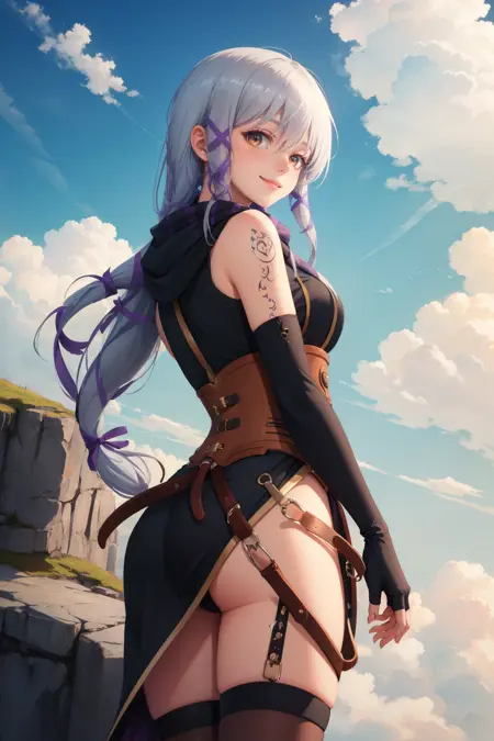 일반 모습의 경우 "긴 캐치볼 머리, 헤어리본, 스틸드 스카프, 검정 드레스, 코르셋, 벨트, 손가락 없는 장갑, 허벅지까지 오는 부츠"를 추가하세요.