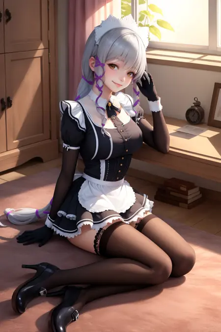 메이드 복장의 경우 "긴 캐치볼 머리, 메이드 모자, 메이드복, 검은 장갑, 검은 허벅지까지 오는 하이힐, 높은 코르셋"을 추가하세요. 그러니까 그냥 메이드 복장이에요.
