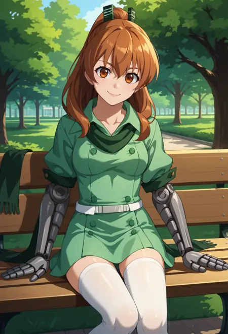 Default Outfit: green dress, short dress, buttons, double-breasted, belt, white thighhighs, green scarf