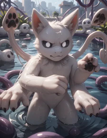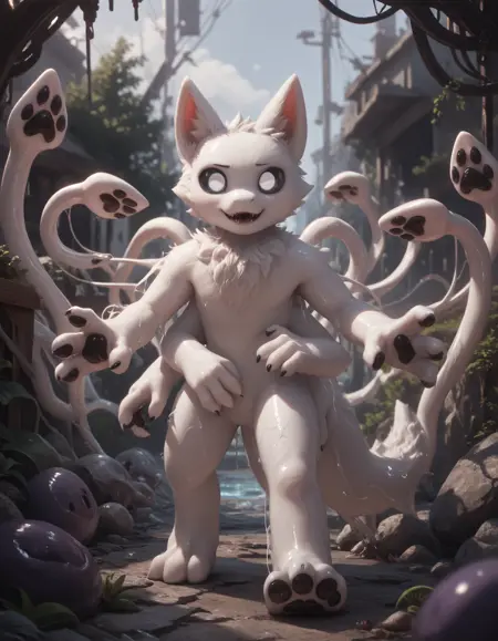 // Illustrious: squid_d0g, changed, black sclera, white body, black pawpads, tentacles, white pupil, multi arm, multi tail, nostrils, shiny skin, goo creature, transformation, ambiguous gender, tentacle paws