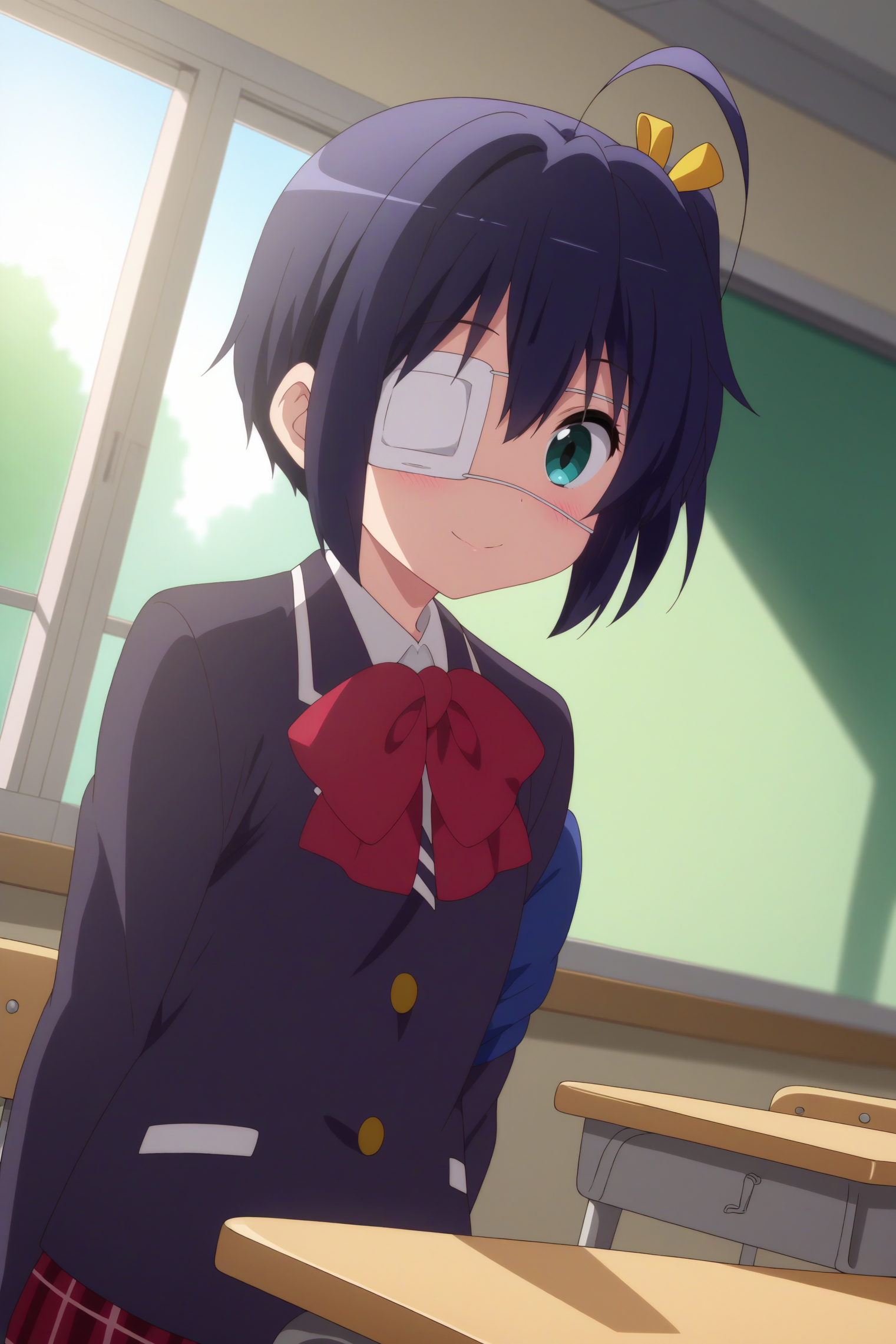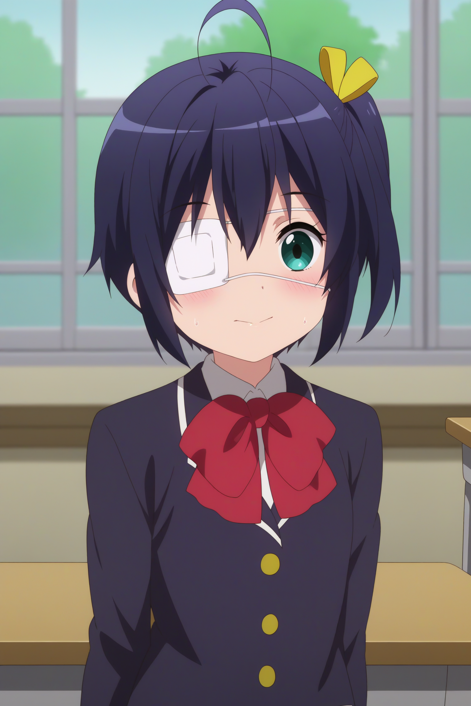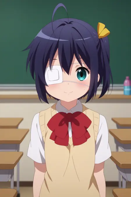 Triggers : 1girl,solo,rikka takanashi,eyepatch,medical eyepatch,one side up,short hair,ahoge,icho private high school uniform,school uniform,ribbon,bow,black hair