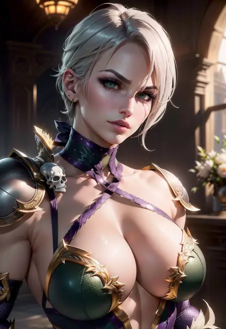 プロンプトに「(濃い緑の目)、(銀色の髪)、(紫色の衣装)、(金色のショルダーパッド)」を加えると、キャラクターの描写に最も近づくことができる。