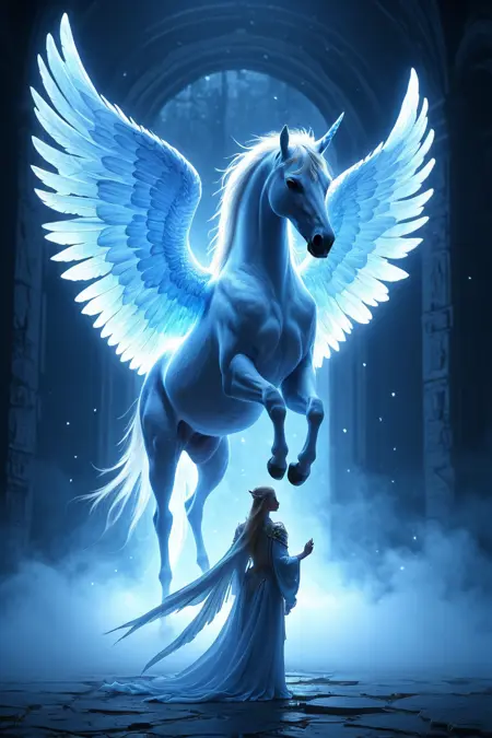 “一幅电影感画面,一位美丽的天使从一个巨大的蓝色发光门户中召唤出一只长着巨大翅膀的天马,天马正缓缓从门户中显现并进入我们的世界,(summoning portal:1.2),背景为天堂,杰作,最佳画质,高度细节”