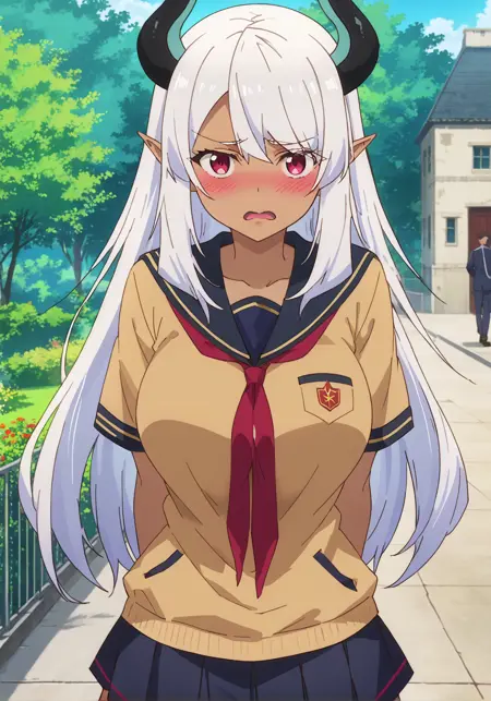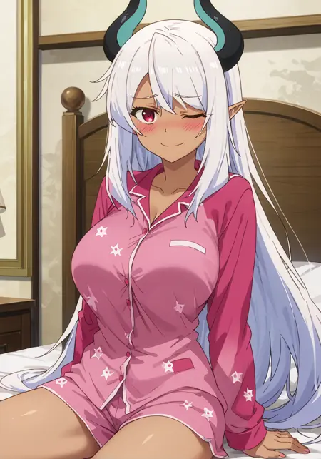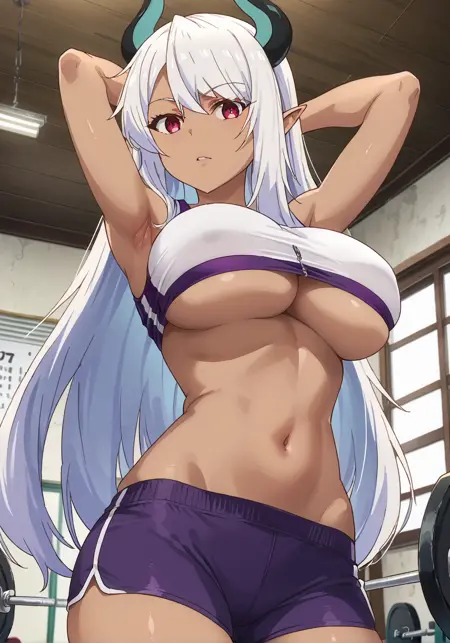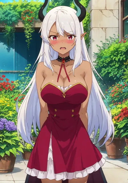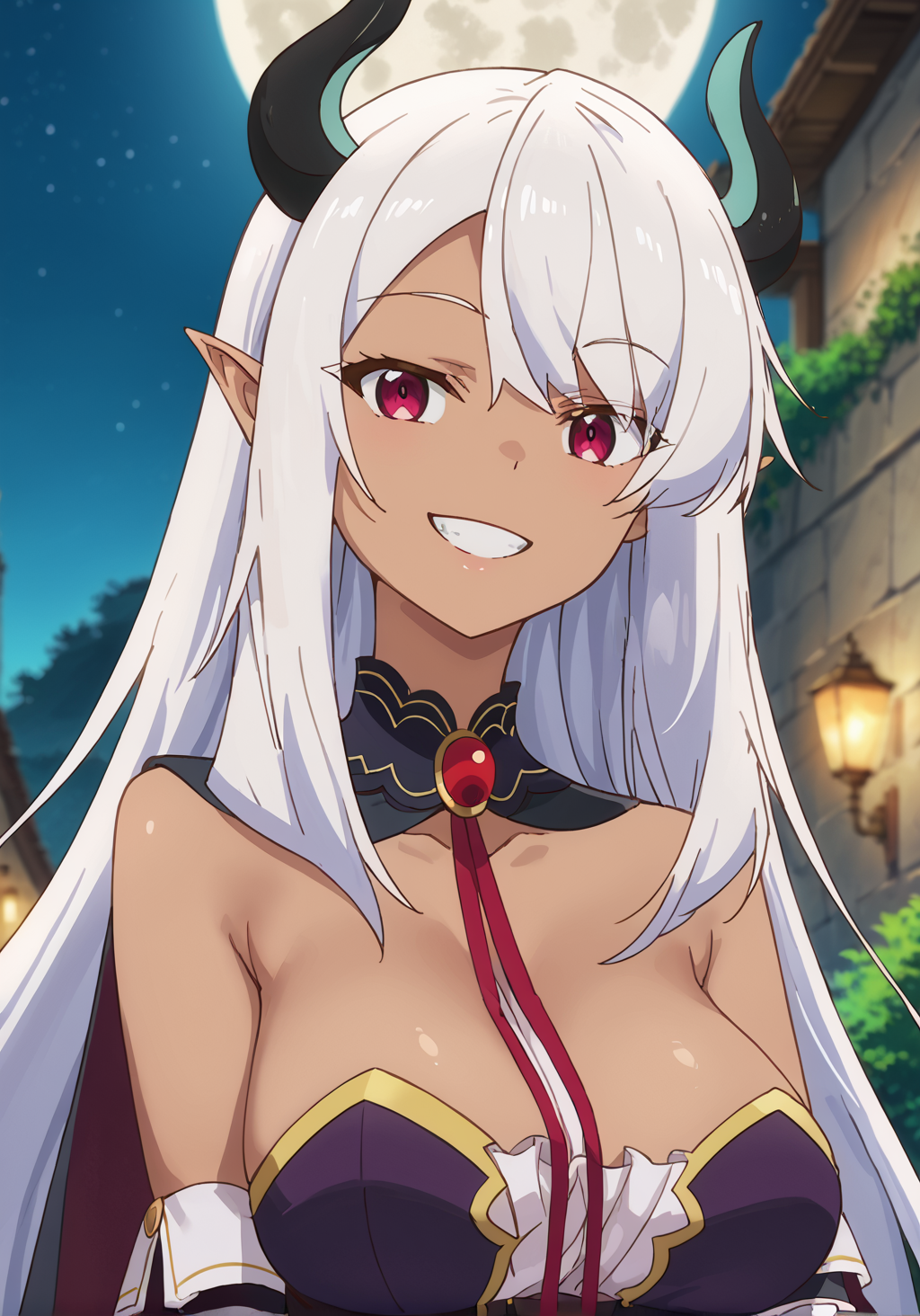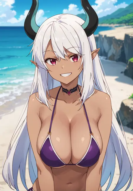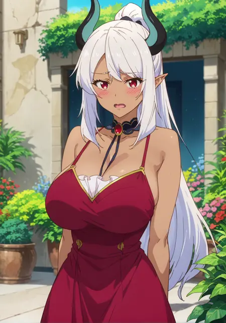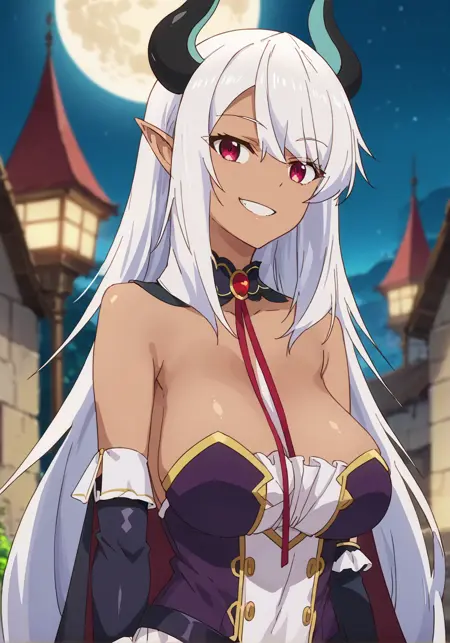 提示词:贝利亚,深色皮肤女性,深色皮肤,尖耳朵,恶魔少女,恶魔角,长发