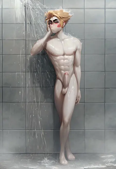 "Lucifer[HazbinHotel], Luci[HazbinHotel], LM[HH], brown eyebrows, slick back hair, slick back hairstyle, blush stickers, grin, sharp teeth, white skin, makeup, 1boy, male focus, blond hair, short hair, red eyes, short blond hair,"