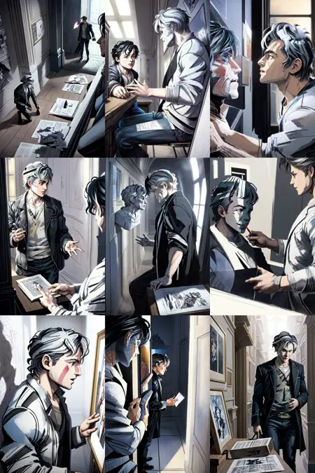 이 두 번째 버전에서는 단지 반쯤 그려진 장면, 즉 캐릭터는 그려져 있고 배경은 실제 생활 그대로인 부분에만 훈련했습니다. 그 결과는 다르며, 때로는 색상이 있고, 때로는 이미지 내부에 만화 프레임이 포함됩니다.