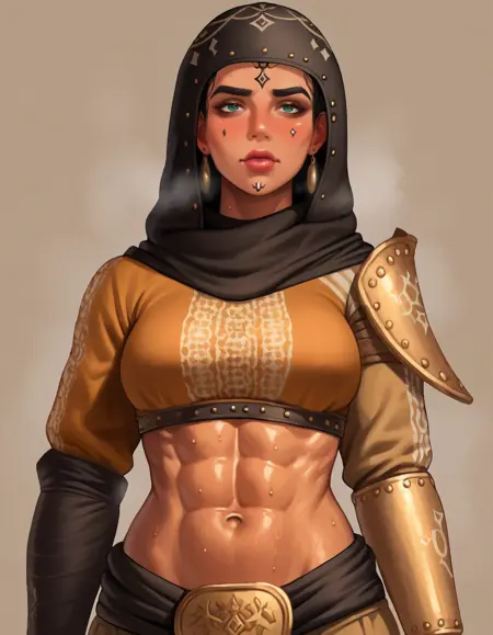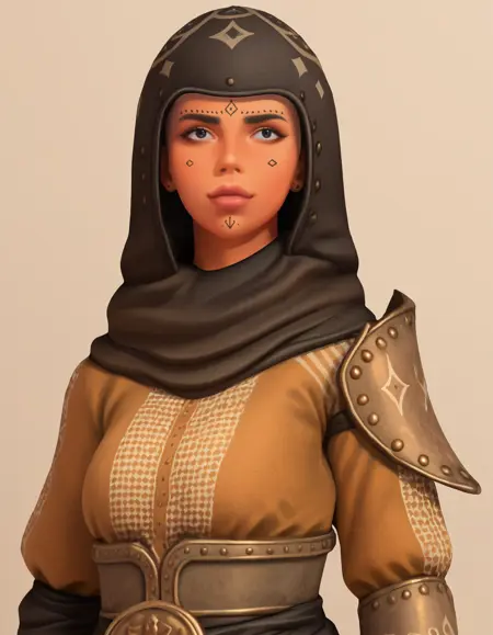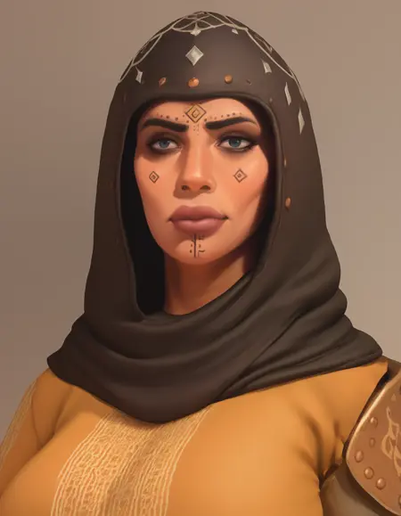Fatandira, hood, armor, dark skin, face tattoo,