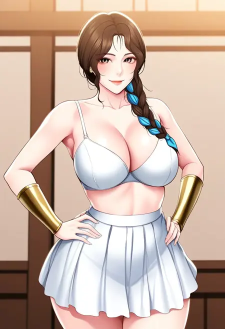 18. ((sexy ancient greek style white bra with gold and red stones decoration, sexy ancient greek style white skirt with gold and red stones decoration, gold arm guards, single hair braid with blue scarf, hair over shoulder, )) + white chastity belt with gold lock,