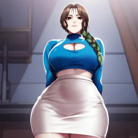 25. ((sexy long-sleeves cut-out blue top, obscene cleavage, huge cleavage, midriff, white pencil skirt, single hair braid with green scarf, hair over shoulder, )) + red long strap handbag, + red panties,