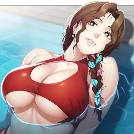 16. ((sexy erotic obscene cut-out red swimsuit, underboob, obscene cleavage, huge cleavage, single hair braid with pink scarf, hair over shoulder, )) + brown flip-flop