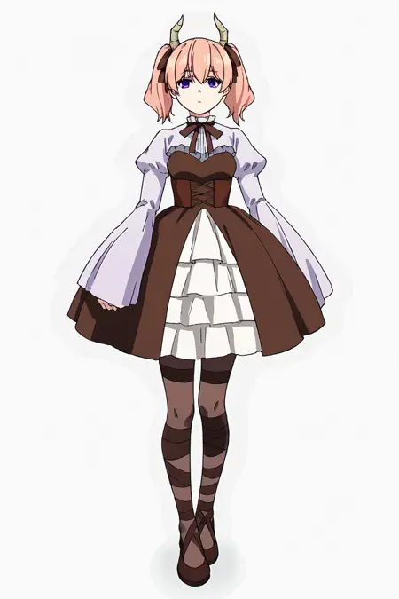 L1N13, pink hair, medium hair, twintails, horns, purple eyes, hair ribbon, brown ribbon, empty eyes