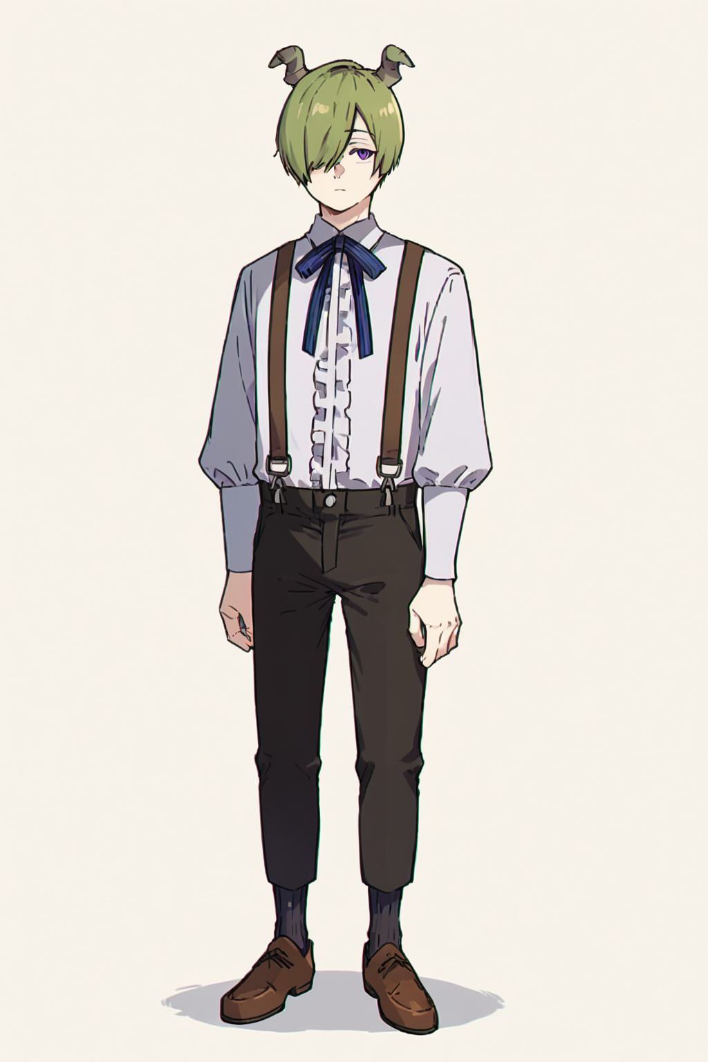 White shirt, suspenders, black pants, black socks, brown footwear, neck ribbon, blue ribbon