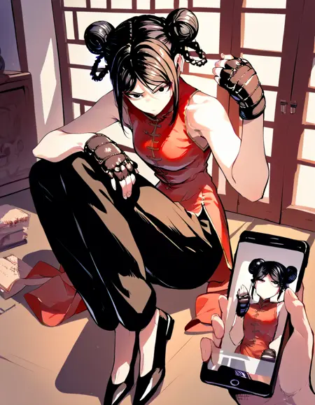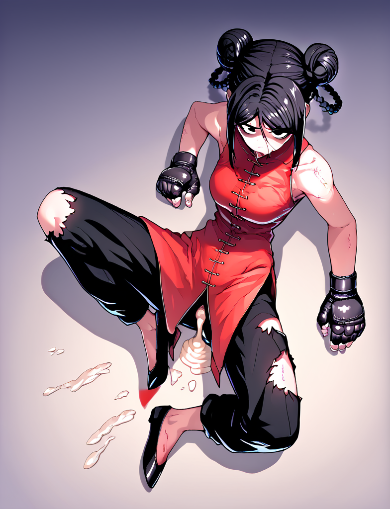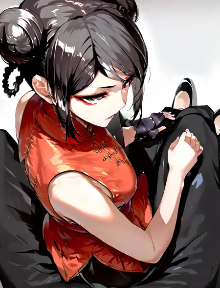 LiYouBa, 1girl, solo,black eyes,black hair,makeup, braid,double hair bun,china red sleeveless dress, black pants,black choth shoes,black fingerless gloves,