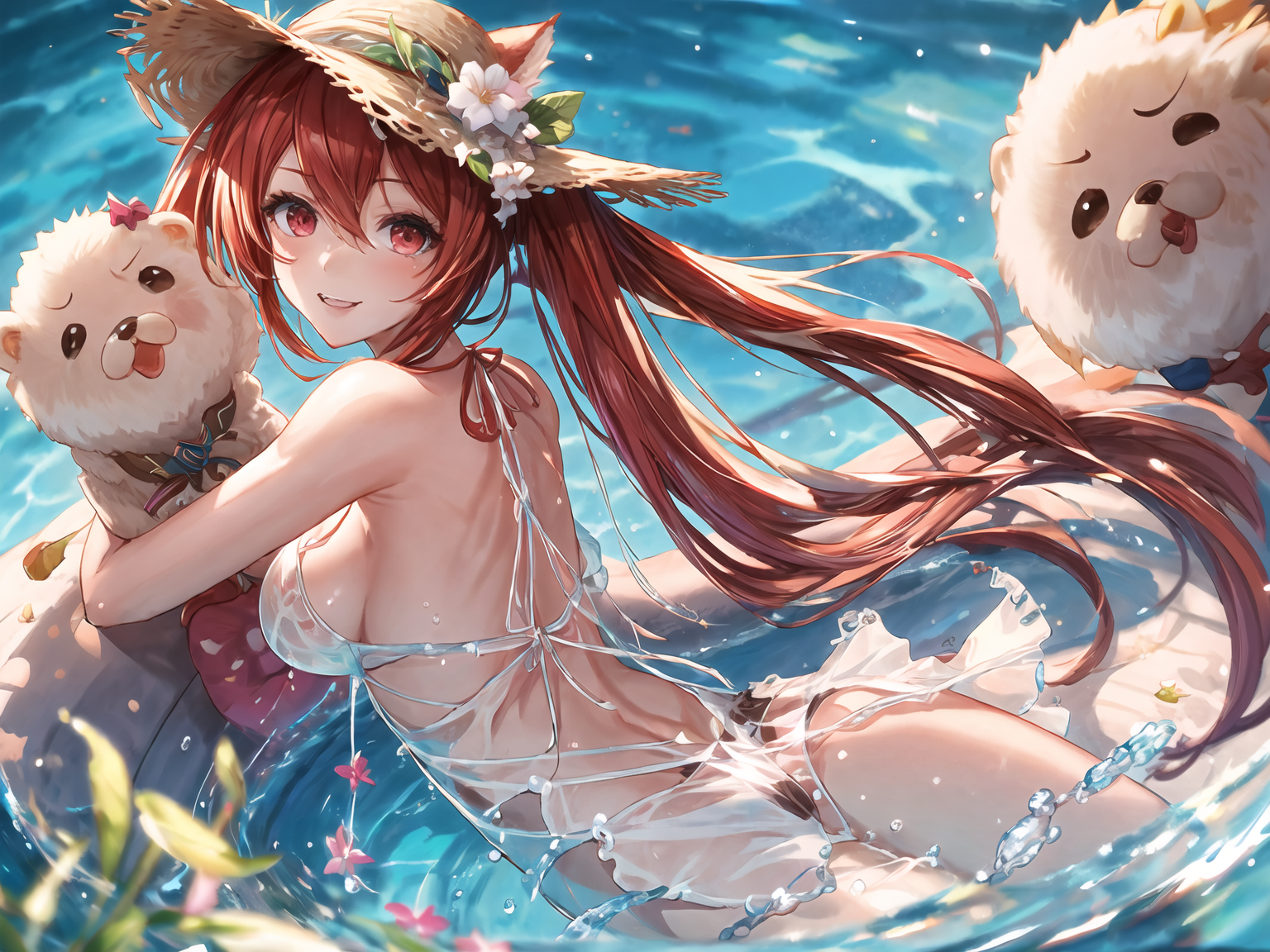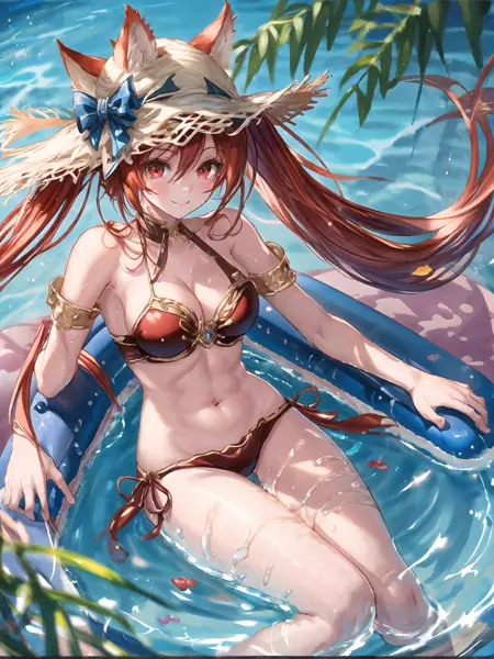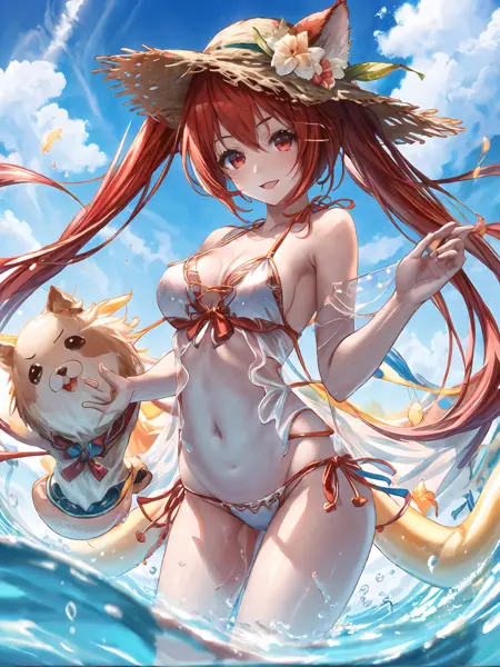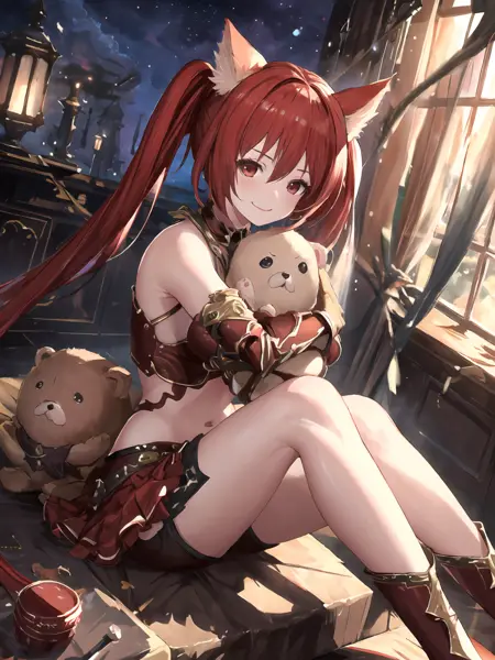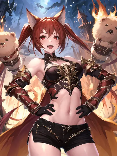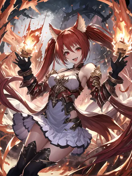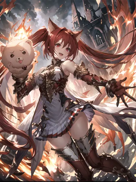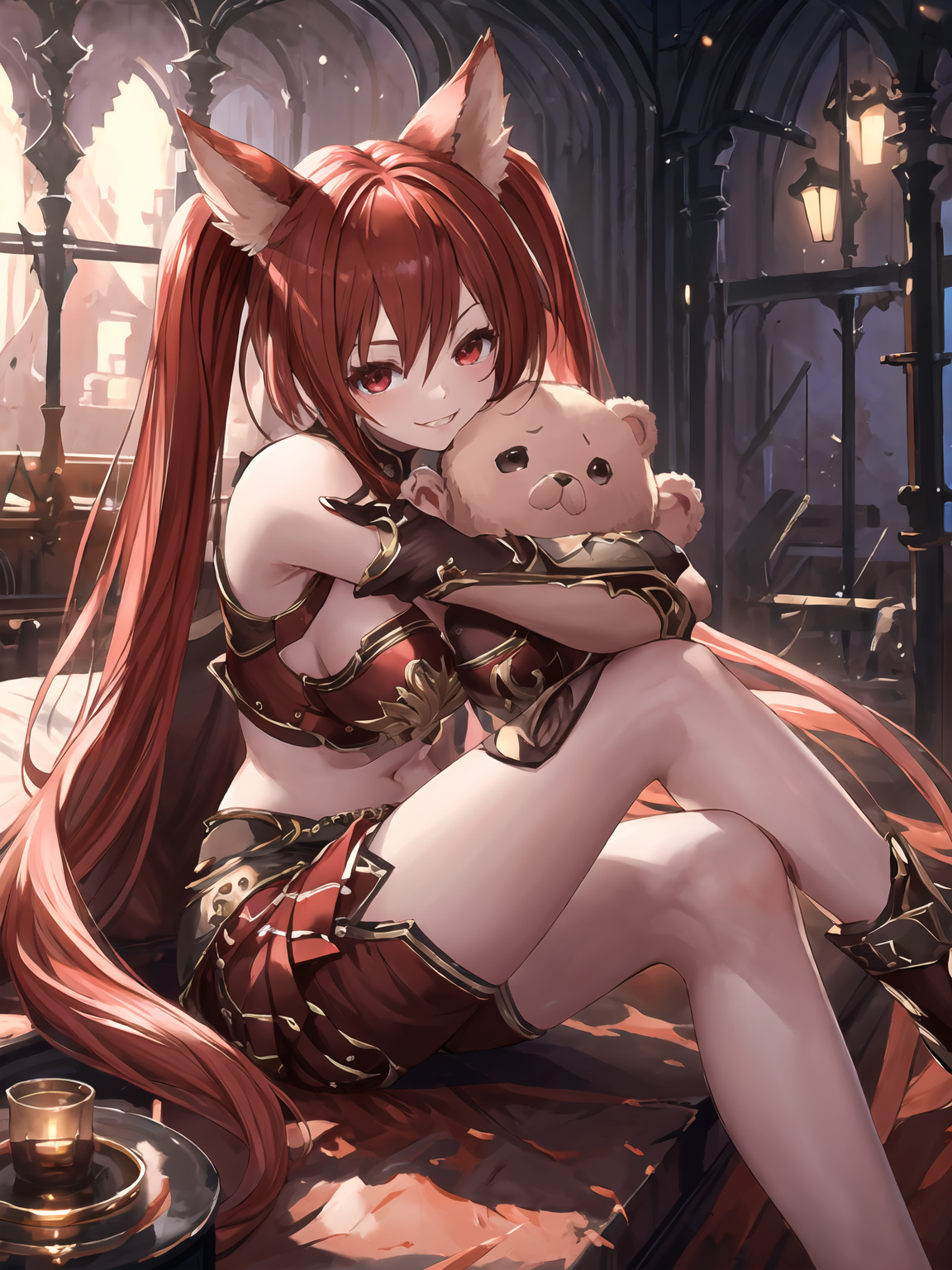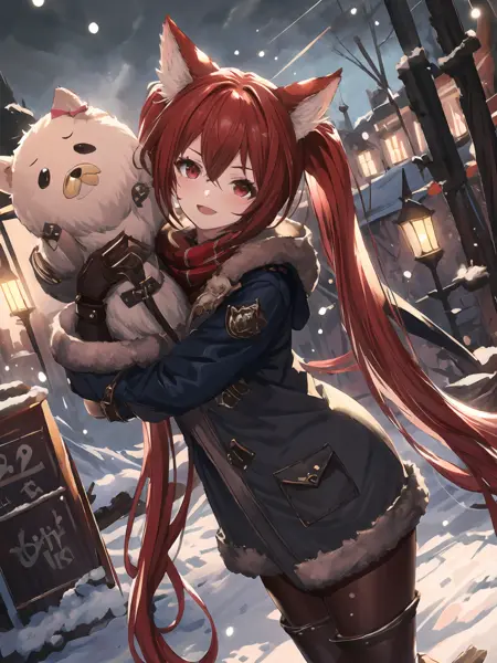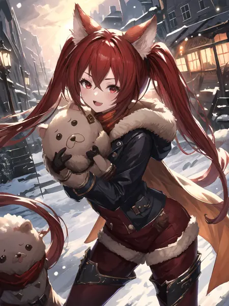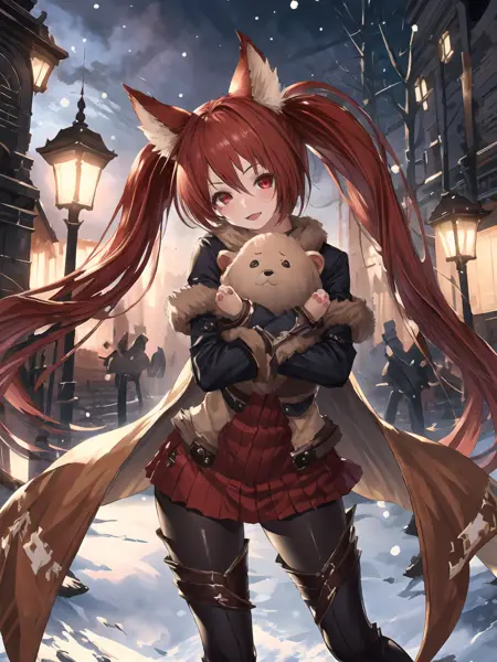 基本特征:红/棕色头发,双马尾,红色眼睛,动物耳朵;