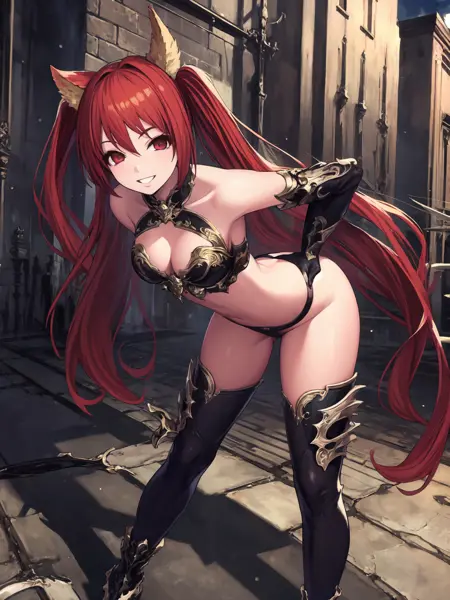 Default costume : (Black) Bikini(armor),shorts/pants/skirt,(gauntlets),(thighhighs),(armored boots) ;