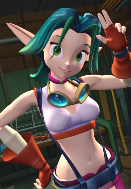 值得注意的是,基拉在第一款游戏中拥有不同的设计,从《Jak 2》开始切换为新造型。我已在“Jak 1设计”和“Jak 2设计”下标注了相关截图。前者风格更夸张卡通,眼睛更大;后者则更写实、细节更丰富,因此建议根据你追求的艺术风格明确指定其中一个版本。