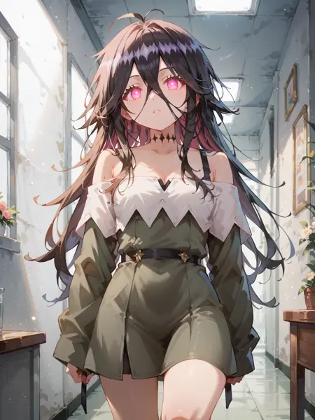 1트리거 단어: sentoin_xx, 1girl, solo, black hair, pink eyes