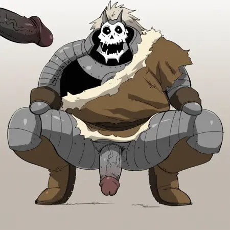 Prompt to help form: "Barry, Living Armor, Metal Horns, Skull Mask, Leather Harness,"