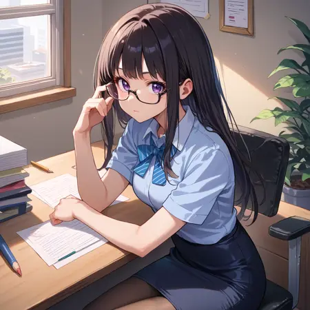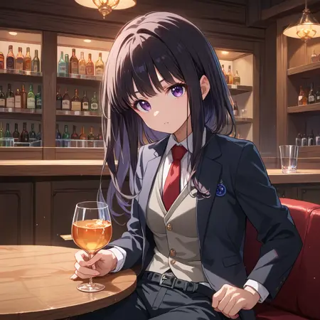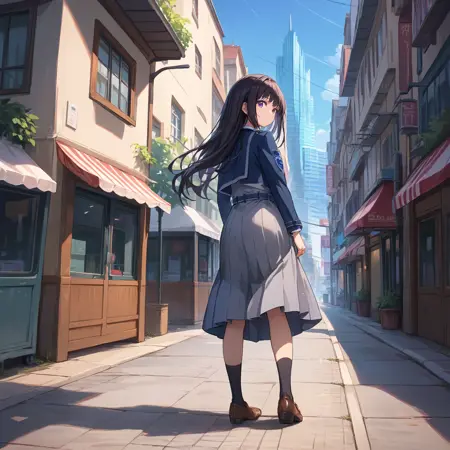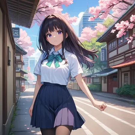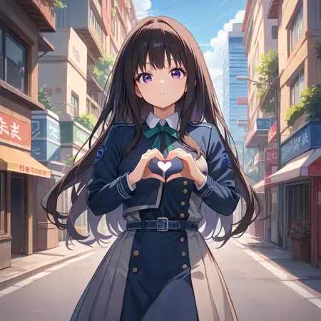 Lycoris uniform : inoue takina, takina def, 長い髪, 黒髪, 紫色の目, Lycoris uniform, 長い袖, 緑色のネックリボン, 青いベルト, 黒い靴下,