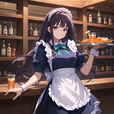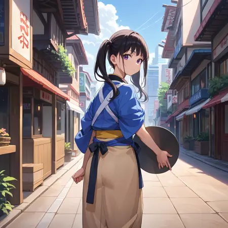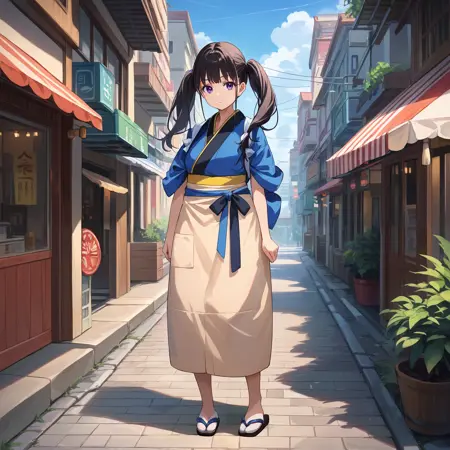 Kimono : inoue takina, takina kimono, 長い髪, 黒髪, ツインテール, 紫色の目, 日本服, 青い着物, アプロン, 腰リボン, 足袋,