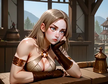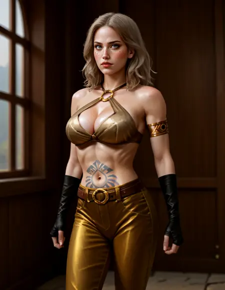 | 训练词汇 | kukuu, low_poly, eq, female, human, light gray eyes, light brown hair, medium hair, freckles, toned body, large breasts, belly tattoo, silk tied bra, gold chest ring, bare shoulders, cleavage, window cleavage, tribal arm bands, black fingerless gloves, belt, gold silk pants, brown boots, 已复制! |