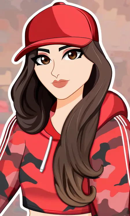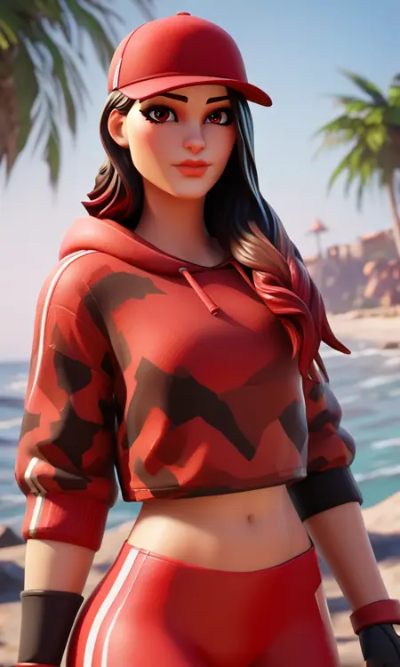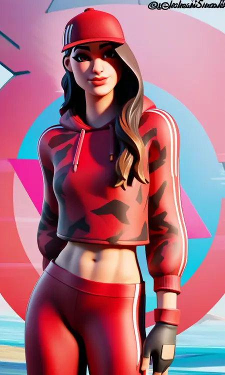 Ruby,堡垒之夜,长发,棕色头发,黑色手套,露指手套,露腹,红色紧身裤,帽兜,连帽衫,棒球帽,红色帽子,迷彩图案,白色条纹,红色配色,紧身裤,手雷腰带,淡妆,白色运动鞋带红色条纹
