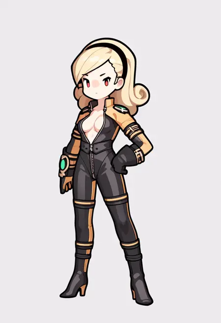 衣装プロンプト:bodysuit, unzipped center opening, cleavage, gloves, boots, high heels