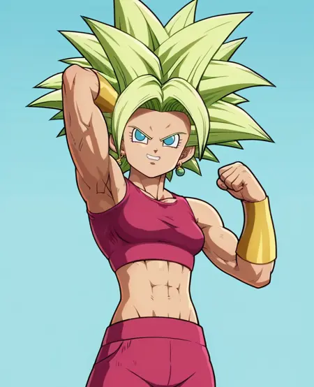 kef1, muscular female, super saiyan, green hair, big hair, crop top, toned female, wristband, midriff, navel, pants, jewelry