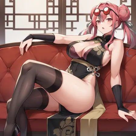Brm_CN, double bun, hair bun, heart-shaped eyewear, eyewear on head, heart pasties, alt china dress, red dress, center opening, cleavage, red pelvic curtain, red sleeves, puffy long sleeves, detached collar, red collar, heart hair ornament, black thighhighs, covered nipples, covered navel, between breasts, lace-trimmed legwear, heart hair ornament,