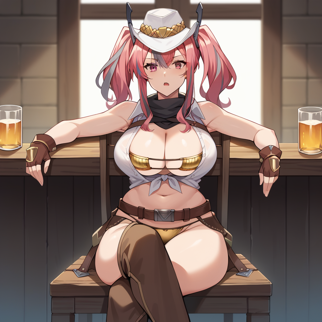 Brm_CWG, gold bikini, eye-patch bikini, gold bottom bikini, cowboy hat, white headwear, chaps, thighs, cleavage, fringe trim, white shirt, sleeveless shirt, open shirt, tied shirt, collared shirt, brown belt, black scarf, hair ornament, midriff, brown gloves, fingerless gloves,