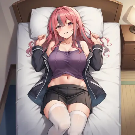 Brm_PAJ, hair down, purple tank top, tank top under clothes, black jacket, black skirt, short skirt, off-shoulder jacket, navel cutout, white thighhighs,