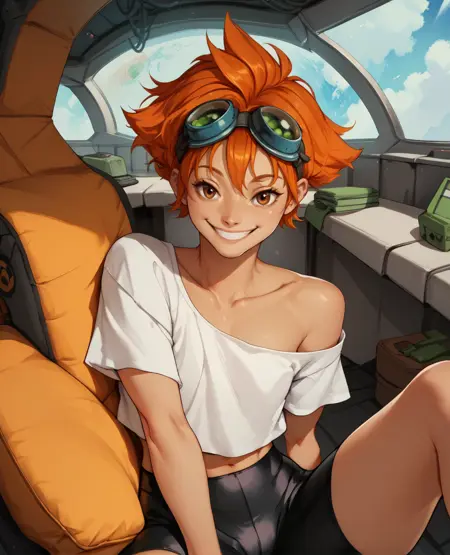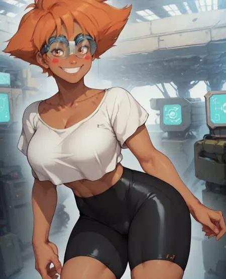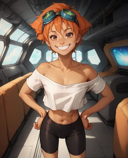 midriff, or navel, - loose shirt, or white shirt, off shoulder, bike shorts, barefoot,