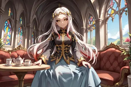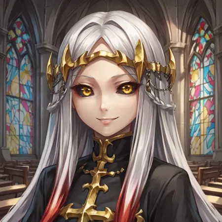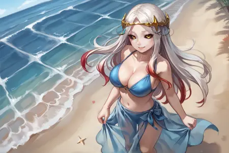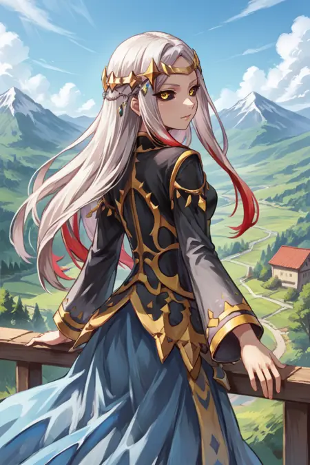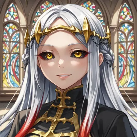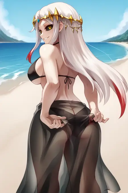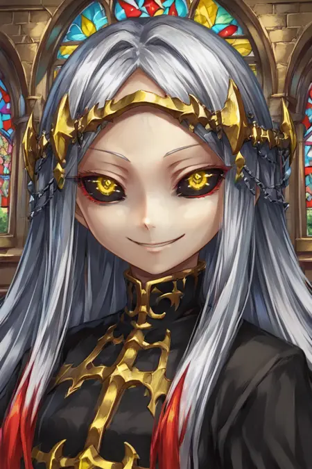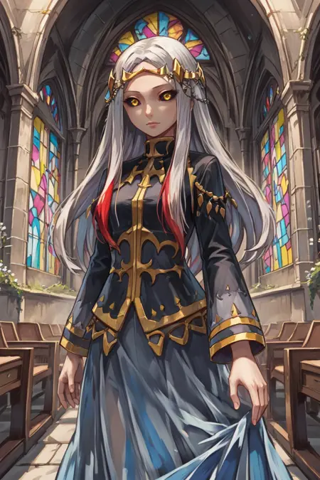 Creator Maxwell: mxwdef, 1girl, black sclera, yellow eyes, white hair, long hair, multicolored hair, red highlights, diadem, black dress, black sleeves, gold trim, blue sarong, black thighhighs,