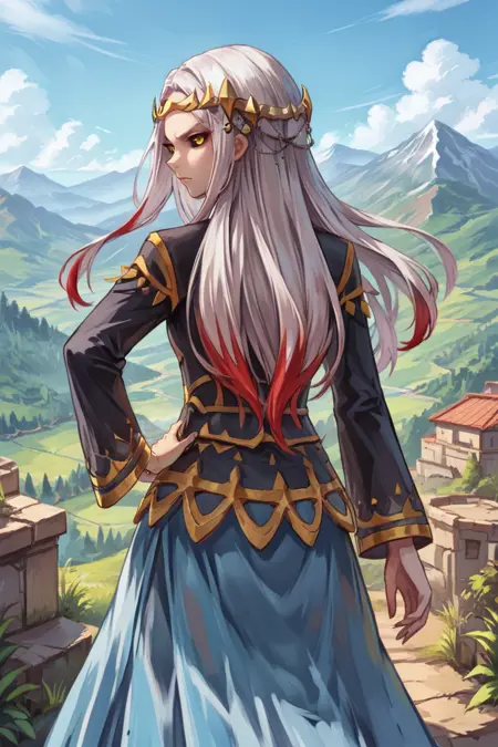 창작자 맥스웰: mxwdef, 1girl, 검은 공막, 노란 눈, 흰 머리, 긴 머리, 다색 머리, 빨간 하이라이트, 관모, 검은 드레스, 검은 소매, 금장식, 파란 사롱, 검은 허벅지 스타킹,
