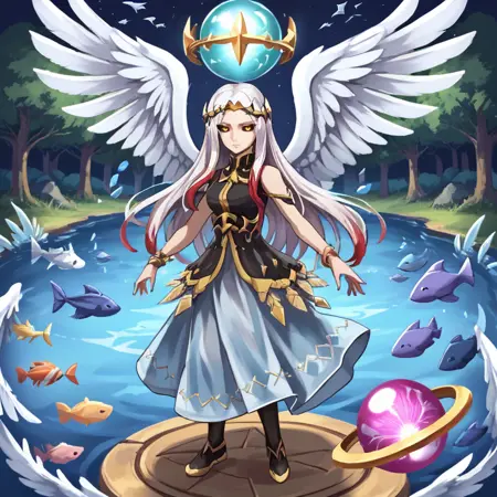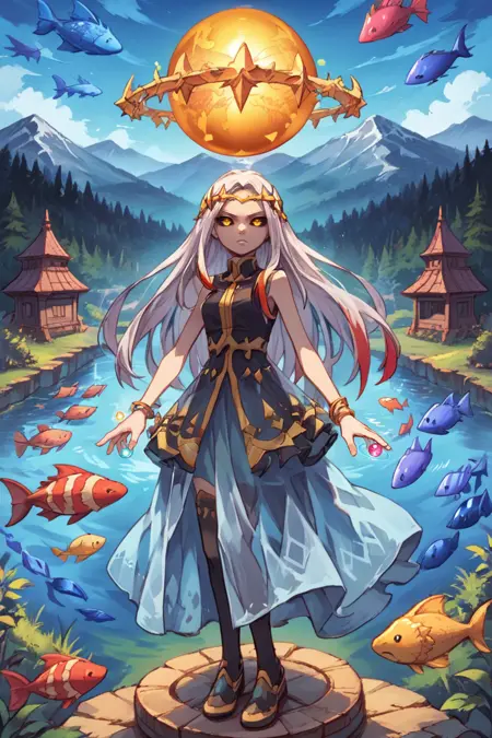 I also tagged all the clutter she comes with in her designs. You can somewhat incorporate them in if you want them, but be prepared for wild nonsense to also occur. And yes, there are fishes and dragons just floating around in her base art. Use one or any combination of: