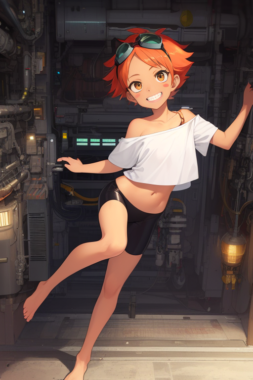 midriff, or navel, - loose shirt, or white shirt, off shoulder, bike shorts, barefoot,