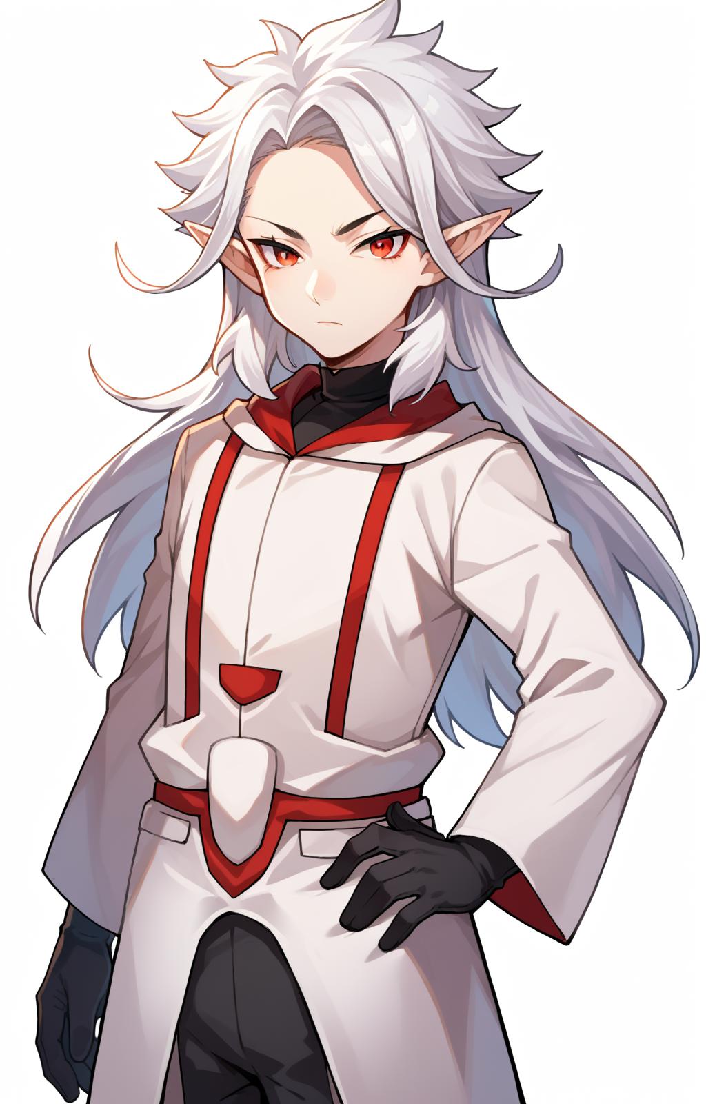 quasar, pale skin, long hair, white hair, red eyes, pointy ears