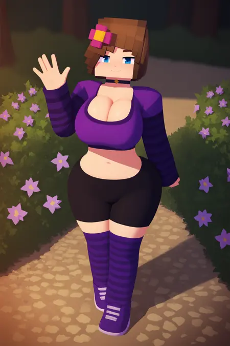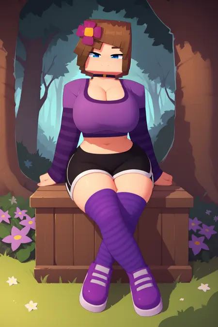 ➜ JennyBelleSTXL, 푸른 눈, 갈색 머리, 단발, 앞머리, 꽃 모양 머리장식, 검은 목걸이, 큰 가슴, 가슴 선, 보라색 크롭탑, 줄무늬 소매, 긴 소매, 곡선형 몸매, 검은 반바지, 줄무늬 허벅지 양말, 보라색 허벅지 양말, 보라색 신발