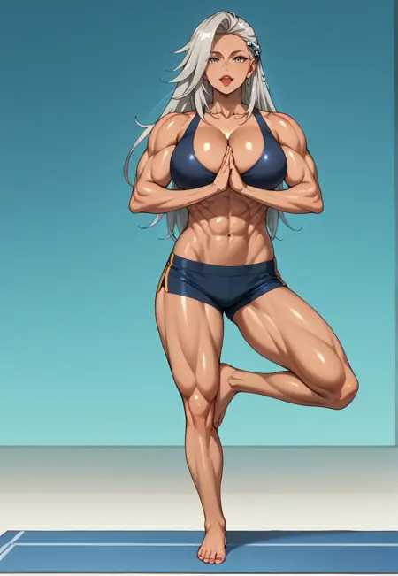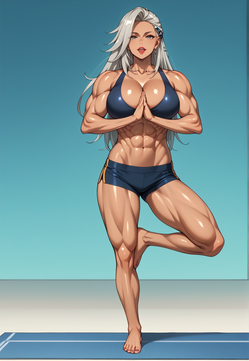 深色皮肤女性,肌肉发达的女性,发饰,长发,马尾,灰发,灰眼睛,巨乳,腹肌,侧腹肌,妆容,口红