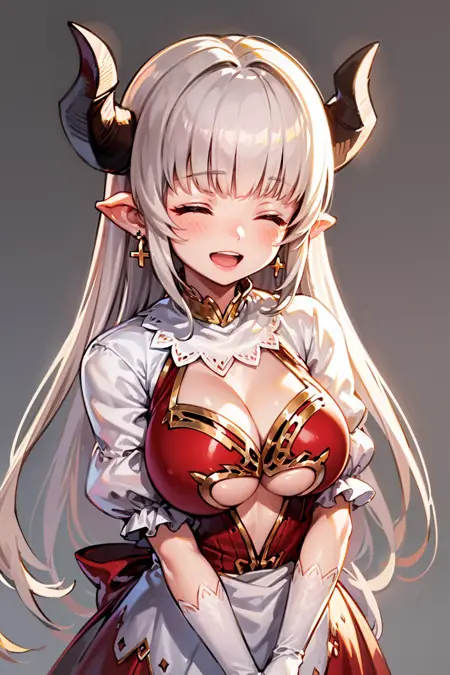 official costumes, add Trigger : cross earrings, red dress,clothing cutout, cleavage, underboob cutout, short white sleeves,white gloves