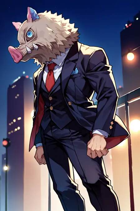 ブタの仮面付きの通常の服の場合:「inosuke, pig mask, topless male, toned, black pants, fur-trimmed pants」を追加してください。
