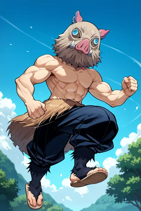 『鬼滅の刃』の伊之助・ハシビラ。Pony Diffusion V6 XL でトレーニング済み。強度0.8-1.0でテスト済み。