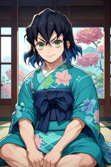 着物の場合:「inosuke, blue hair, black hair, multicolored hair, short hair, green eyes, cyan kimono, sash, floral print」を追加してください。