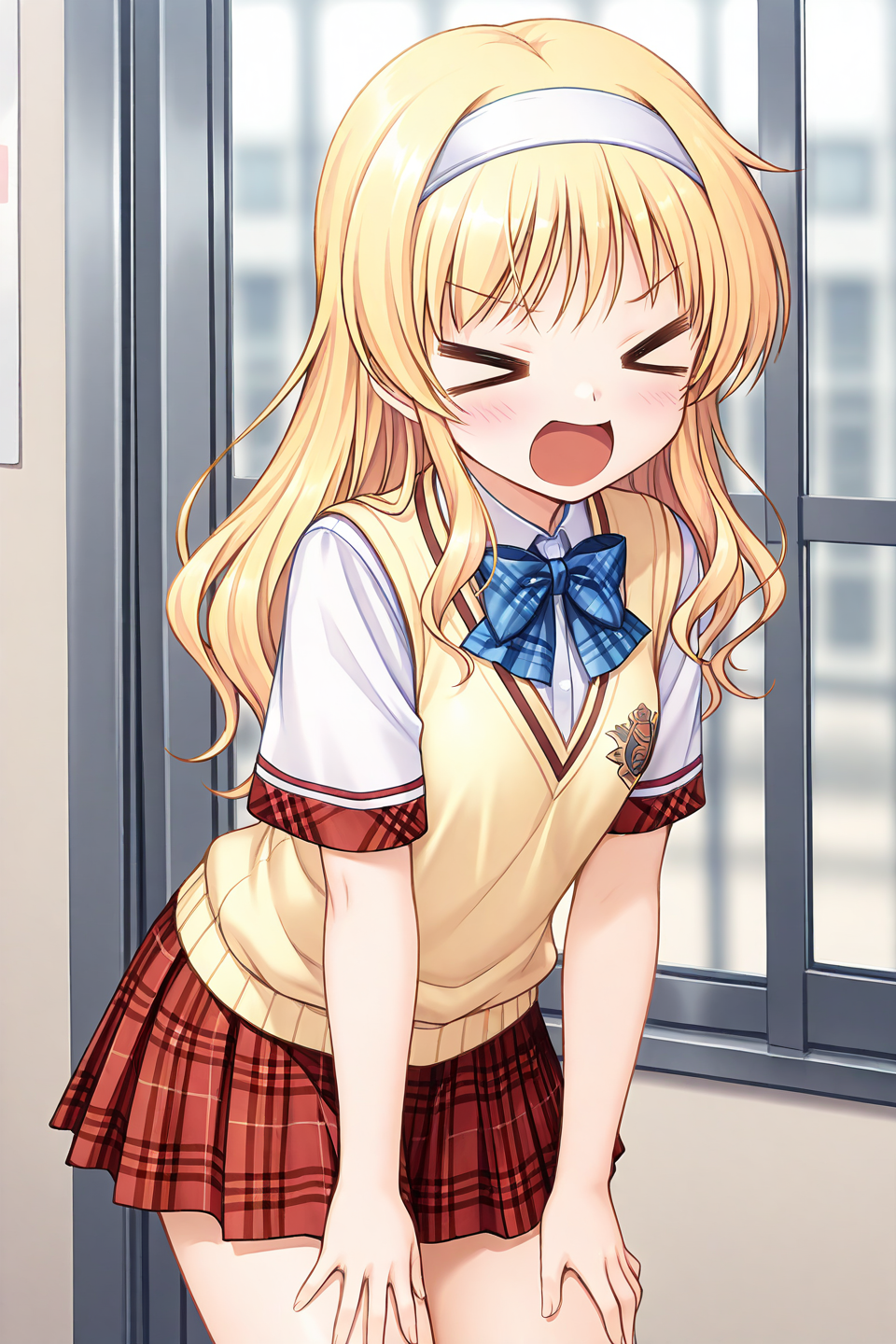 hairband, white hairband, school uniform, shirt, short sleeves, vest, sweater vest, skirt, plaid, pleated skirt, red skirt, plaid skirt, bow, bowtie, plaid bow, plaid bowtie,