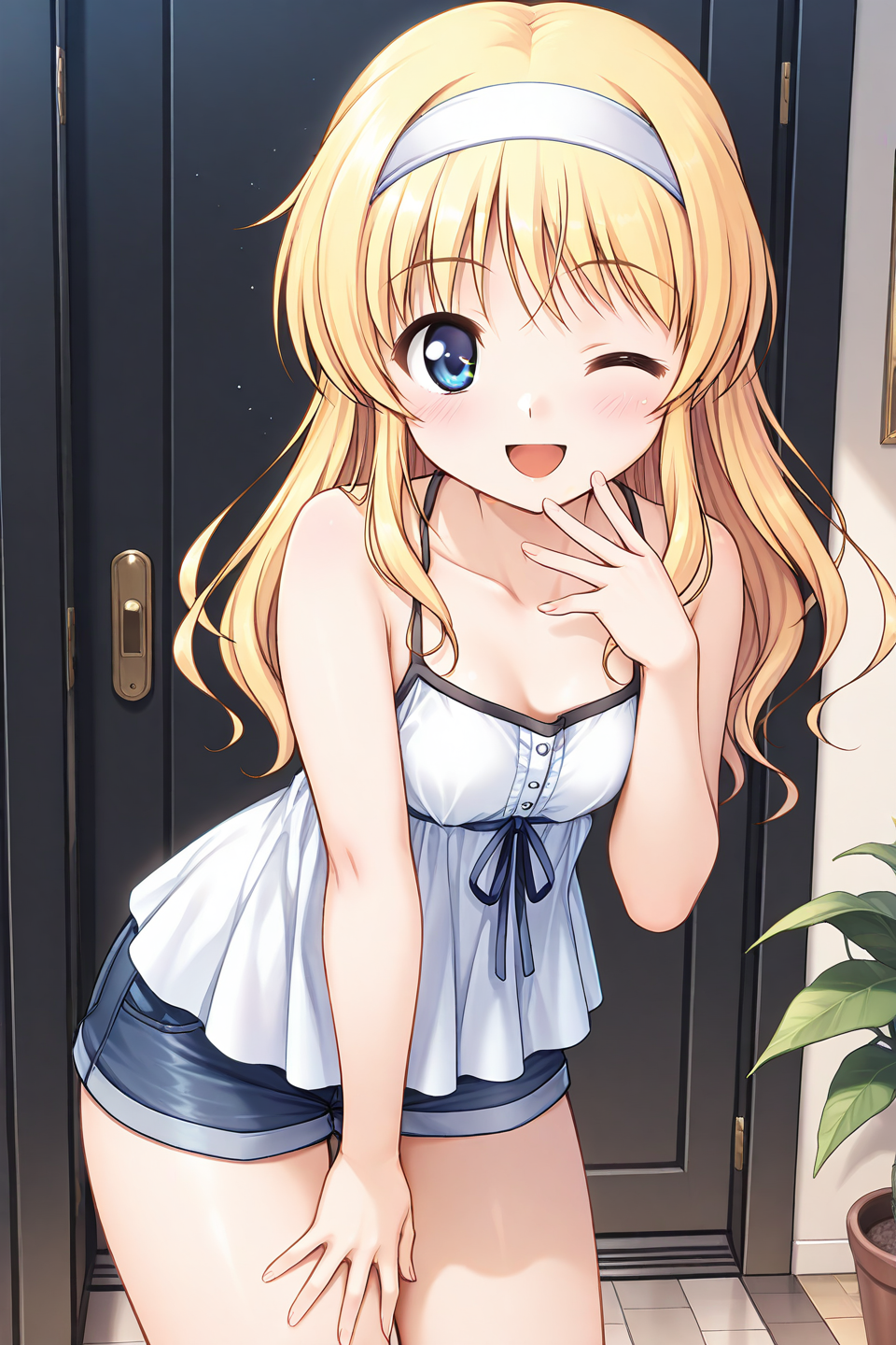 hairband, white hairband, casual, camisole, sleeveless, bare shoulders, striped, shorts, short shorts, blue shorts,