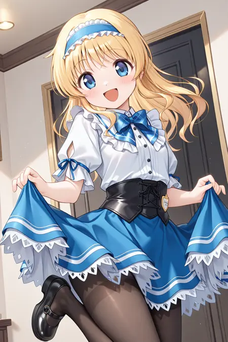 waitress, lolita hairband, blue hairband, ribbon, dress, shirt, frills, short sleeves, puffy sleeves, corset, plaid, bow, plaid bow, bowtie, skirt, blue skirt, pantyhose, black pantyhose, shoes,