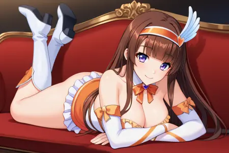 sayaka, brown hair, long hair, purple eyes, hairband, large breasts, detached collar, magical girl, ribbon, frilled skirt, frills, collarbone, cleavage, detached sleeves, ribbons, thick thighs, ankle boots, white boots